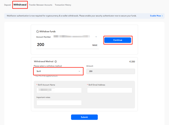 اختر المحفظة الإلكترونية المناسبة (Skrill/Neteller/Bitwallet/Sticpay/Astropay/Perfect Money/AirTM) في القسم السفلي من "طريقة السحب" وانقر على "إرسال".
