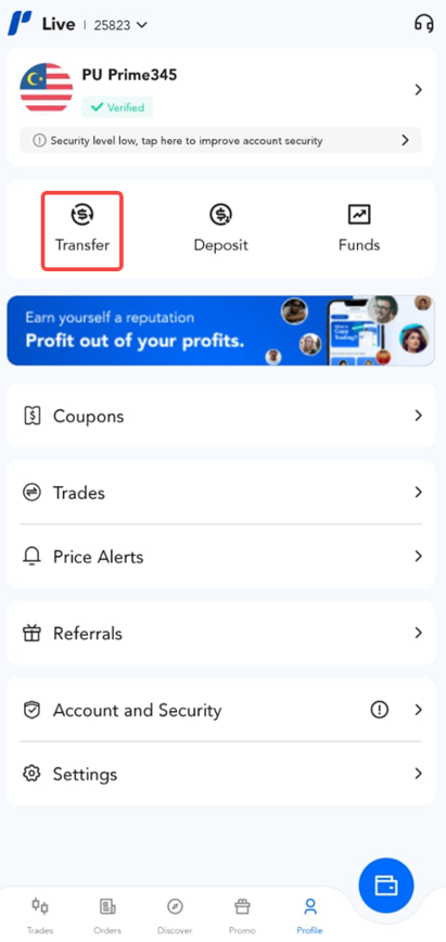 Help Center | PU Prime | More Than Trading PU Prime App استعلام اپلیکیشن PU Prime كيفية تنفيذ تحويل الأموال؟ 1. انقر على زر ”الملف الشخصي“. 2. انقر على زر ”نقل“. 3. أدخل تفاصيل تحويل الأموال وانقر على ”التالي“ لمتابعة تحويل الأموال.