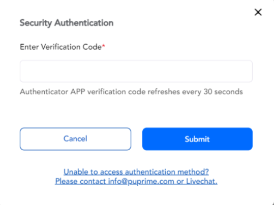 For security purposes, please open your authenticator application and enter the provided code. To set up the authenticator application, click on this link: https://helpcenter.puprime.com/hc/en-001/articles/9222563828111-How-to-modify-security-authenticator-application