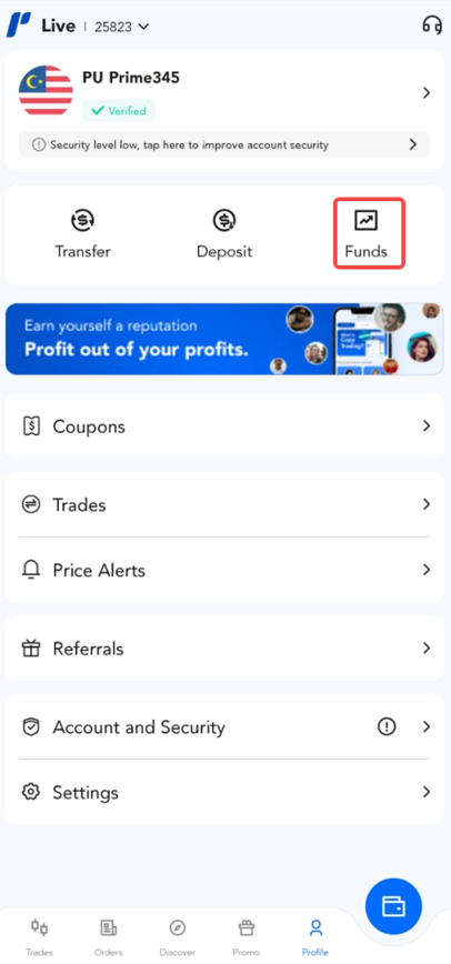 Help Center | PU Prime | More Than Trading Pu Prime App PU Prime App Enquiry How to withdraw funds? Step 1: Click on the "Profile" button. Step 2: Click on the "Funds" button. Step 3: Click "Withdraw" to proceed with your withdrawal request. Step 4: Select your account and your withdrawal amount and click "Next".
