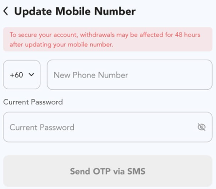 5. Haz clic en "Enviar OTP por SMS" y completa el OTP. Una vez completado, tu número de contacto será cambiado exitosamente.