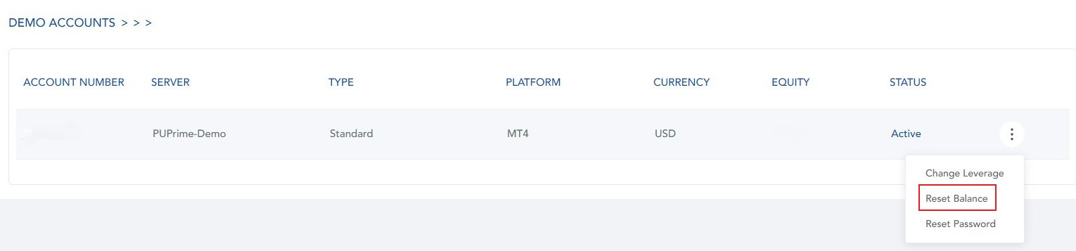 ग्राहक क्लाइंट पोर्टल में लॉगिन कर सकते हैं और डैशबोर्ड मेनू से "डेमो खाता" चुन सकते हैं। ग्राहकों को डेमो खाता बैलेंस को रीसेट करने के लिए बैलेंस रीसेट आइकन पर क्लिक करना होगा।