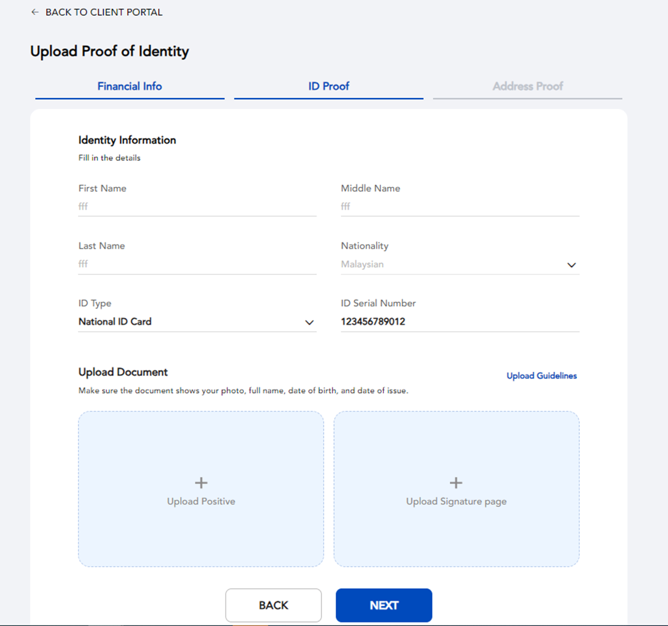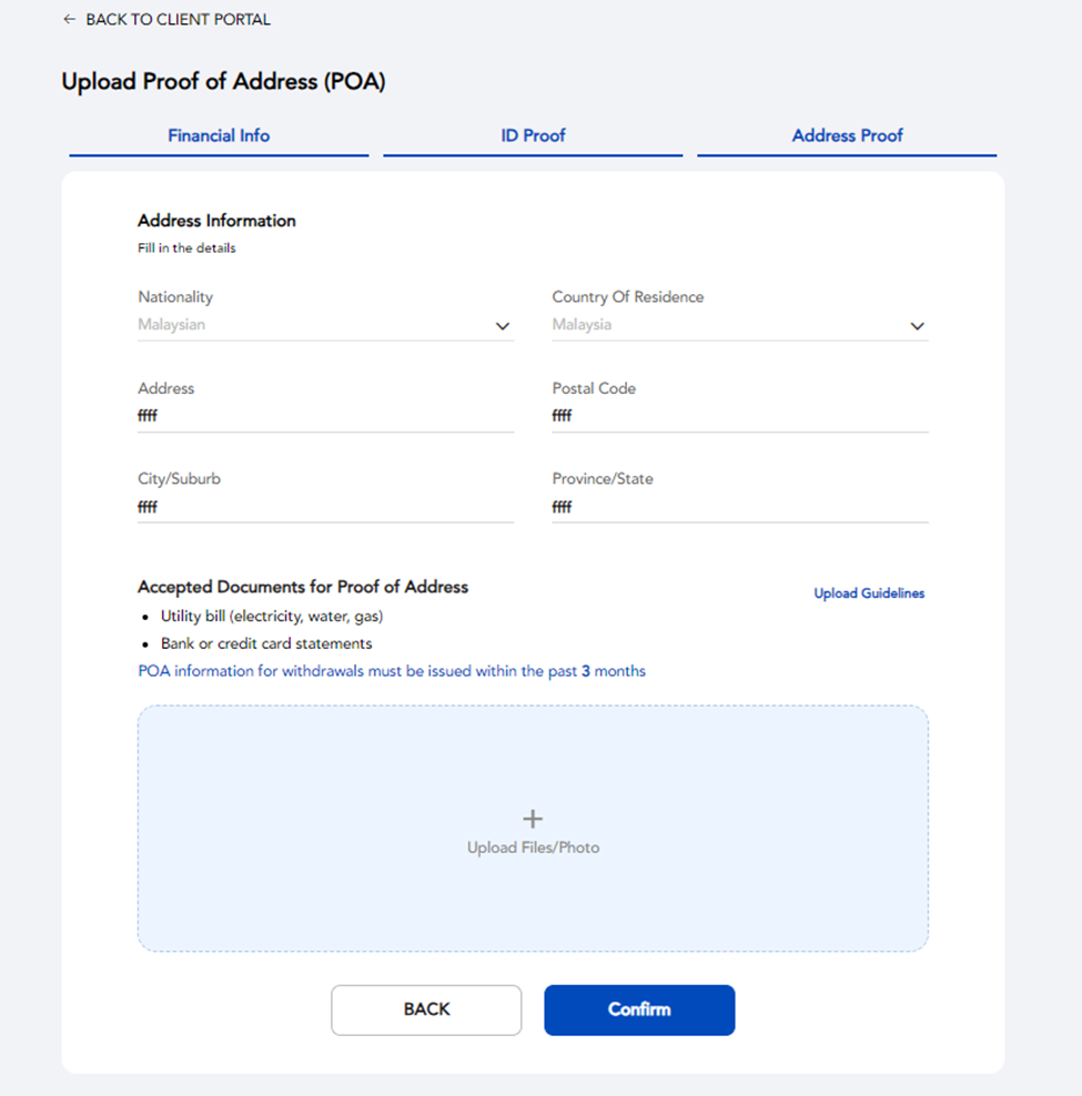 उसके बाद, आवश्यक वित्तीय विवरण भरें और पता की प्रमाणित करने के लिए पते की प्रमाणित के लिए आपकी पिछले तीन महीनों के भीतर जारी किया गया प्रमाण पत्र और आपकी पहचान पत्र / पासपोर्ट की प्रमाणित करें, फिर इंटरनेशनल बैंक वायर ट्रांसफर जमा के साथ आगे बढ़ें।