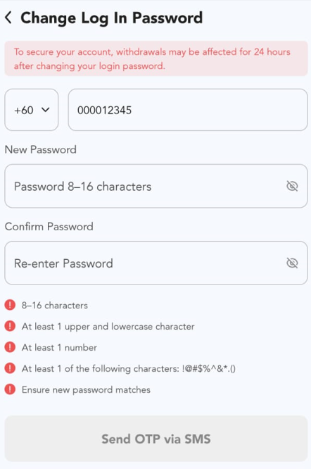 Catatan: Harap diperhatikan bahwa penarikan akan tidak tersedia selama 24 jam setelah modifikasi kata sandi berhasil.