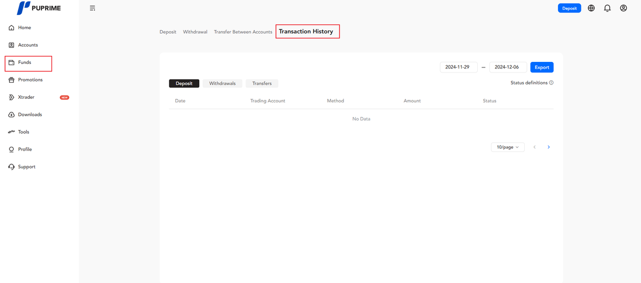 Dopo aver effettuato l'accesso al portale clienti, seleziona "FONDI" dal menu della dashboard, quindi scegli "Storico delle transazioni" per visualizzare le tue transazioni di deposito, prelievo e trasferimento.