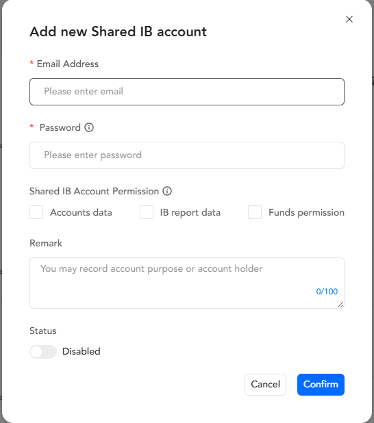 L'Introducing Broker può condividere il proprio account IB con altri dopo aver effettuato l'accesso al proprio Portale IB, cliccando su "Profilo IB ". Inserire l'indirizzo email e impostare una password per l'account condiviso. L'Introducing Broker può scegliere se condividere i dati del proprio account, i dati del rapporto IB e le autorizzazioni sui fondi. Attivare la condivisione impostando su "Abilitato", quindi cliccare su "Conferma".