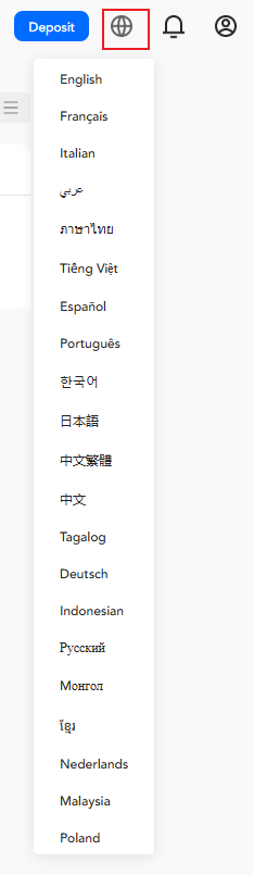 Help Center | PU Prime | More Than Trading アカウントマネジメント クライアント Portal クライアントポータルで言語を変更する方法は? クライアントポータルにログインした後、クライアントはページの右上隅にあるこのボタンを選択し、好みの言語を選択することができます。