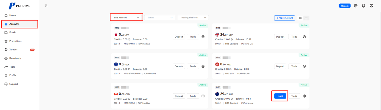 Help Center | PU Prime | More Than Trading アカウントマネジメント クライアント Portal マイナス残高をリセットする方法は? クライアントポータルにログインした後、「アカウント」に移動し、「ライブアカウント」が選択されていることを確認してください。そうすると、マイナス残高のあるアカウントに青いボタンの「リセット」が表示されますので、それをクリックして進めてください。 ウィンドウが表示されます「リセットに同意する場合、残っているクレジットが差し引かれます」と。リセットを進めるには「同意する」をクリックしてください。これにより、アカウントのネガティブバランスとクレジットがリセットされます。 . 注意事項- すべてのポジションがクローズされていることを確認してください。そうでない場合、リセットボタンは取引アカウントの下に表示されません。- マイナス残高のリセットは、PAMMおよびMAMを除くすべてのアカウントタイプで利用可能です。- 過去30日間に3回以上のマイナス残高リセットリクエストが検出された場合、処理には最大7日かかる場合があります。- USD 3,000またはそれに相当する額を超えるマイナス残高の場合、処理には最大7日かかる場合があります。
