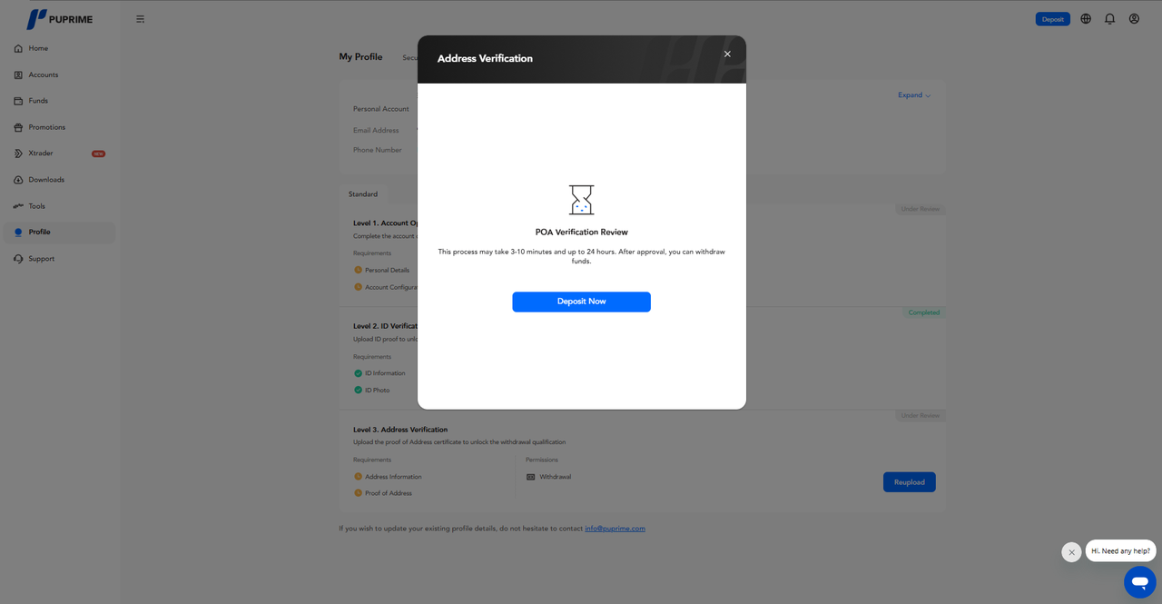 Kemudian, butang 'Deposit Now' akan muncul semasa anda menunggu Pengesahan Alamat anda diluluskan.
