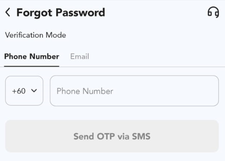 3. Ketik "Send OTP via SMS" untuk nombor telefon atau "Send" untuk emel.
