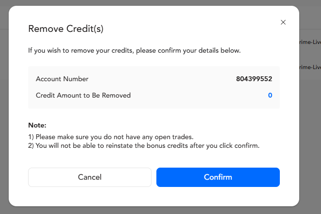 Konta z bonusem kredytowym nie mogą inicjować transferów wewnętrznych.Aby usunąć kredyt, klient powinien kliknąć opcję "Konta" w menu pulpitu, a następnie wybrać przycisk