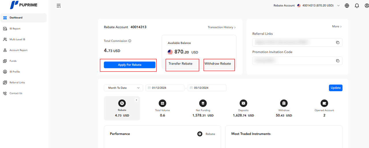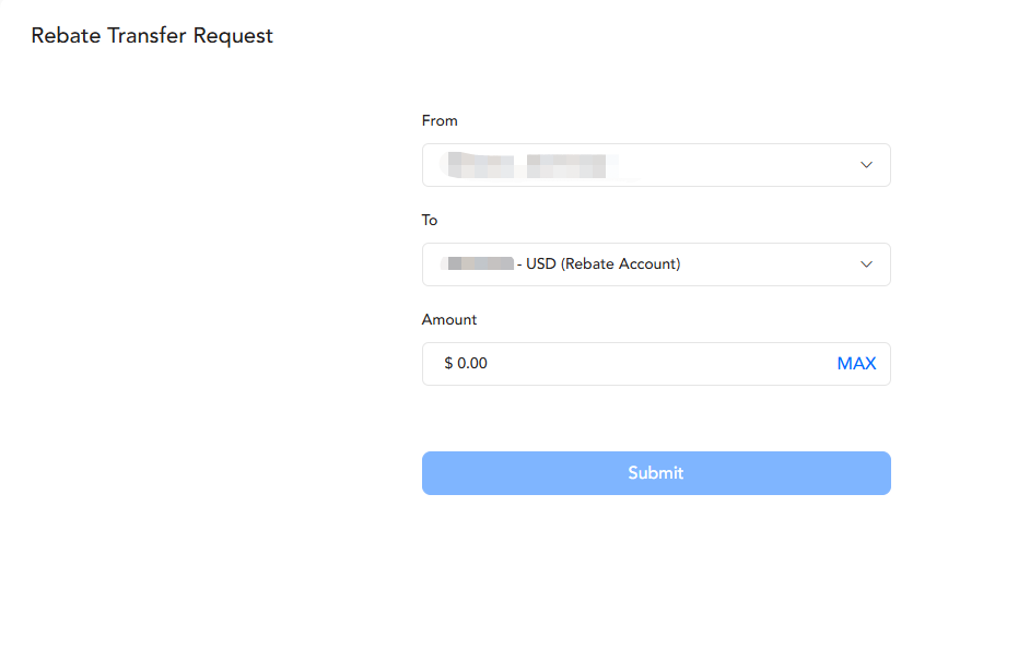 【Transferir Rebate】- Para transferir o valor do rebate entre contas com a mesma moeda de conta.