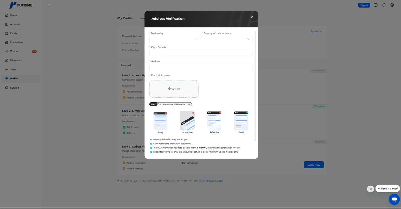 - ลูกค้าจะถูกนำไปยังหน้า "การยืนยันที่อยู่" เพื่อทำการลงทะเบียนขั้นตอนที่ 3 โดยการกรอกข้อมูลที่อยู่ ตามด้วยการอัปโหลด หลักฐานที่อยู่