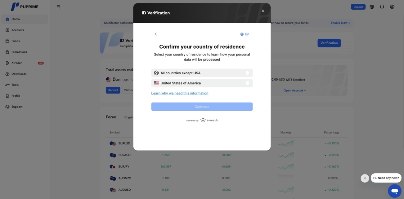 *โปรดตรวจสอบว่าคุณไม่ได้เป็นผู้พำนักอยู่ในสหรัฐอเมริกา, สิงคโปร์, ออสเตรเลีย หรือจีน เนื่องจาก PU Prime ไม่รับลูกค้าจากประเทศเหล่านี้. - กรอกข้อมูลผู้สมัครของคุณแล้วคลิก “ดำเนินการต่อ”