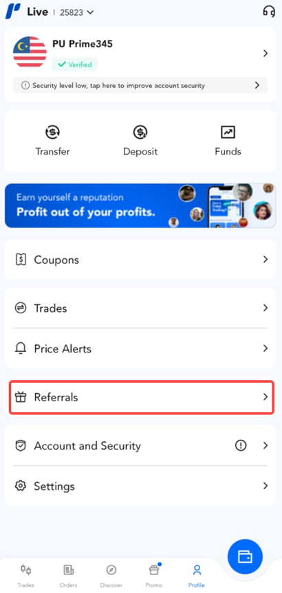 Help Center | PU Prime | More Than Trading PU Prime App สอบถามแอป PU Prime วิธีการแนะนำเพื่อน? 1. คลิกที่ปุ่ม "โปรไฟล์" 2. คลิกที่ปุ่ม "ลิงก์อ้างอิง" 3. คลิก "ชวนเพื่อนเลย. 4. คัดลอกและแชร์รหัสอ้างอิงหรือ QR code ของคุณ.