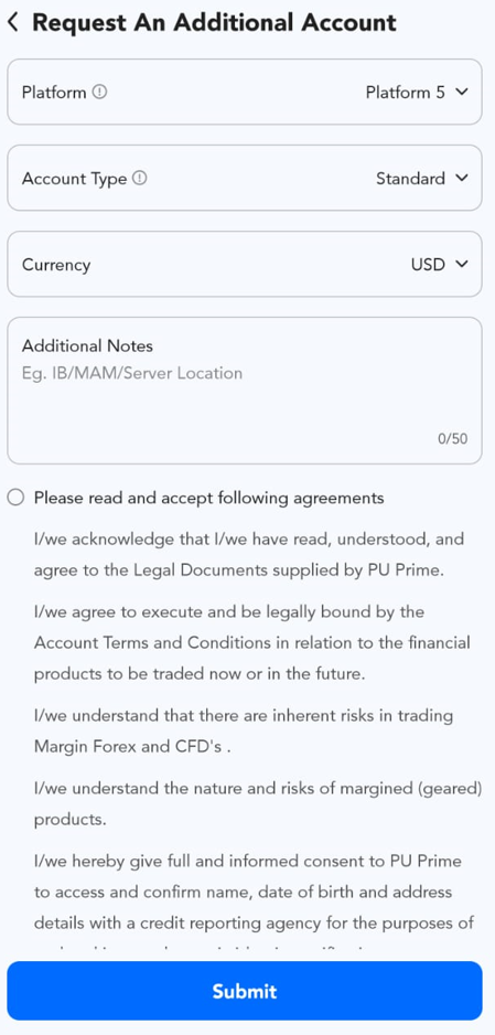 Help Center | PU Prime | More Than Trading PU Prime App สอบถามแอป PU Prime ฉันจะเปิดบัญชีจริง (Live Account) ที่สองได้อย่างไร? 1.คลิกที่ปุ่ม "จัดการบัญชี" 2. คลิกที่ "เปิดบัญชีจริงใหม่". 3. ใส่แพลทฟอร์มและประเภทบัญชีที่คุณต้องการ แล้วคลิก "ส่ง" เพื่อเปิดบัญชีเพิ่มเติม.