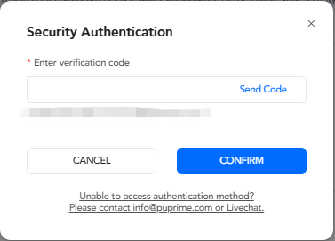 Vì mục đích bảo mật, vui lòng mở ứng dụng xác thực và nhập mã được cung cấp. Để thiết lập ứng dụng xác thực, hãy nhấp vào liên kết này: https://helpcenter.puprime.net/hc/en-001/articles/9222563828111-How-to-modify-security-authenticator-application