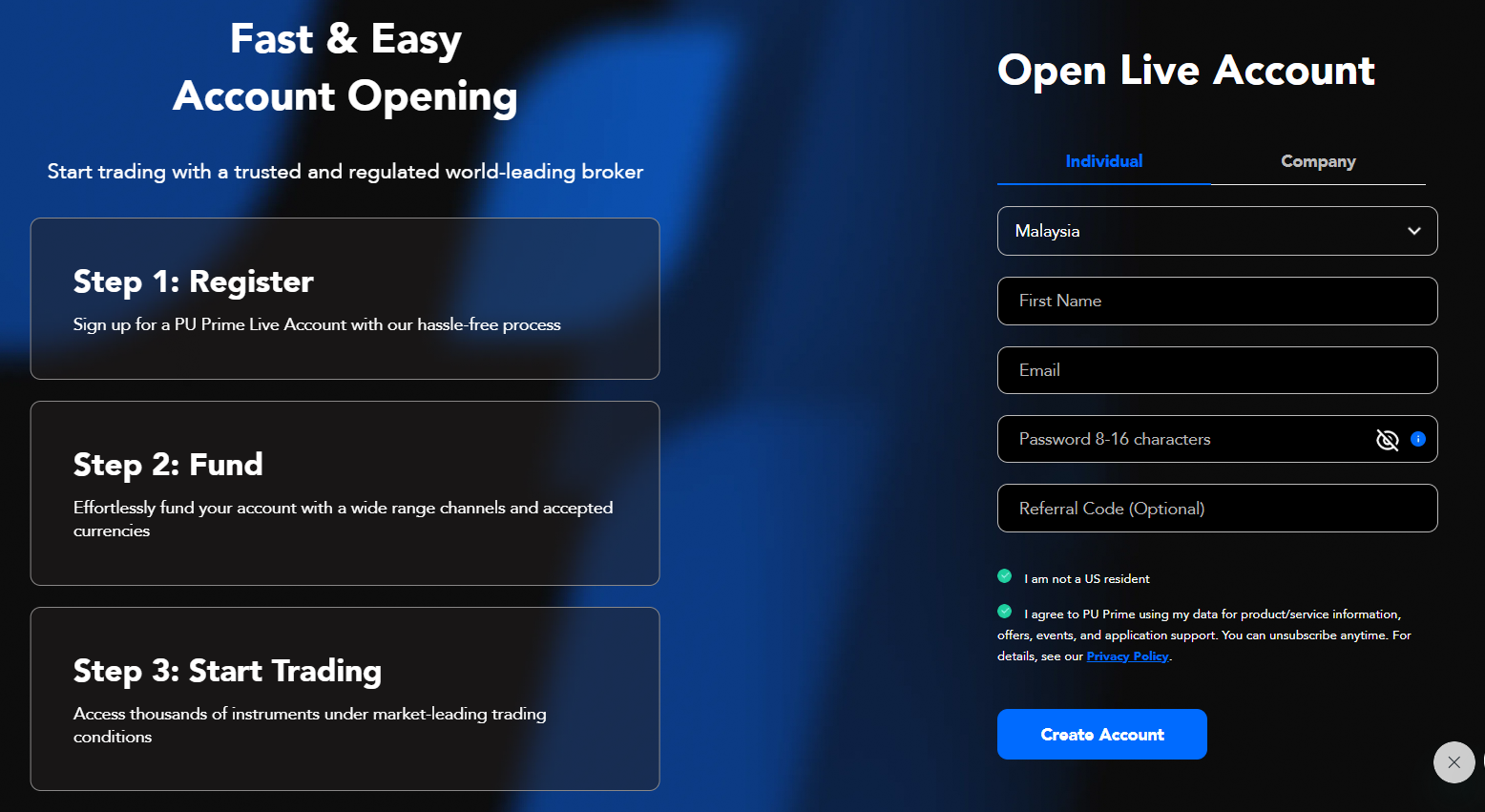 *请确保您不是美国、新加坡、澳大利亚或中国的居民,因为PU Prime不接受这些国家的客户。 - 填写您的申请人数据并点击“继续”。