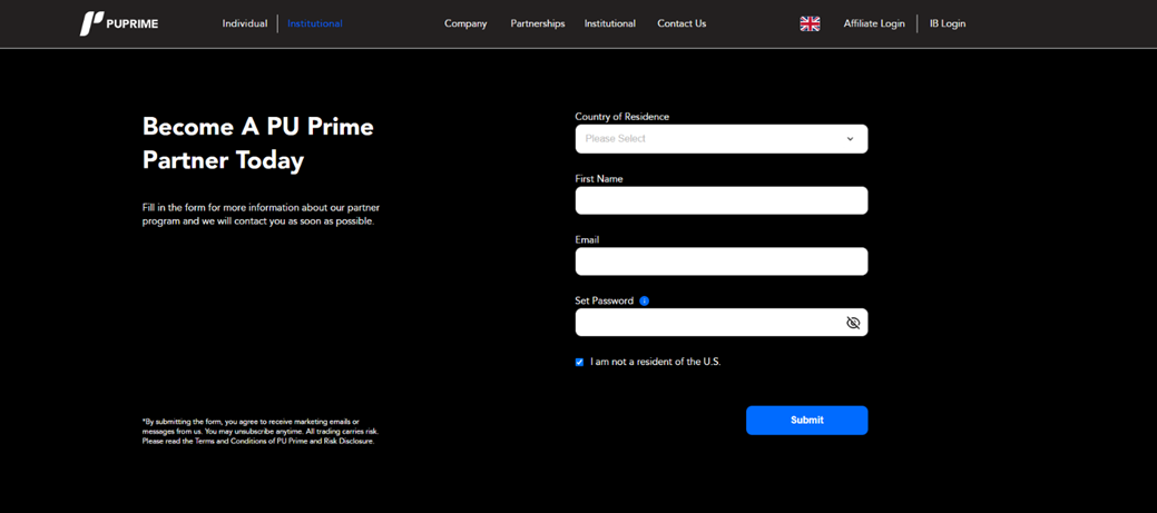 - 请通过 https://www.puprimepartners.com/ib-registration/ 进入 PU Prime 注册网站并填写所需信息。