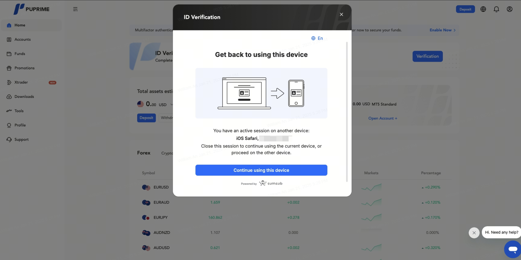 注意:一旦您在手机上选择继续,将弹出一个窗口提示您在另一部手机或桌面会话的设备上有一个活跃的会话。
