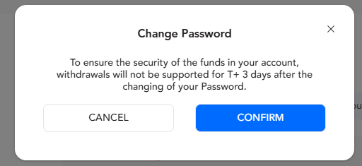 帮助中心 | PU Prime | More Than Trading 账户管理 客户专区 如何在客户专区中更改密码? 登录客户专区后,导航至页面右上角,选择“验证”并选择“安全管理”。 为确保您账户中资金的安全,更改密码后的T+3天内不支持提款。选择“确认”以继续更改密码。 客户需要输入当前密码,并根据密码要求设置新密码。选择“确认”以完成密码更改。