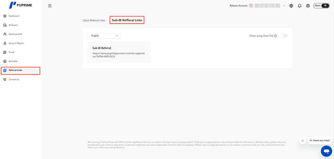 帮助中心 | PU Prime | More Than Trading Partnership IB 我在哪里可以获取我的子IB推荐链接? 介绍经纪人可以在登录到他们的IB专区后,通过“推荐链接”获取他们的Sub-IB推荐链接,并选择Sub-IB推荐链接。 注意: IB可以使用推荐链接页面右上角的共享短链接功能,以更好地保护他们的共享链接,防止被他人更改。